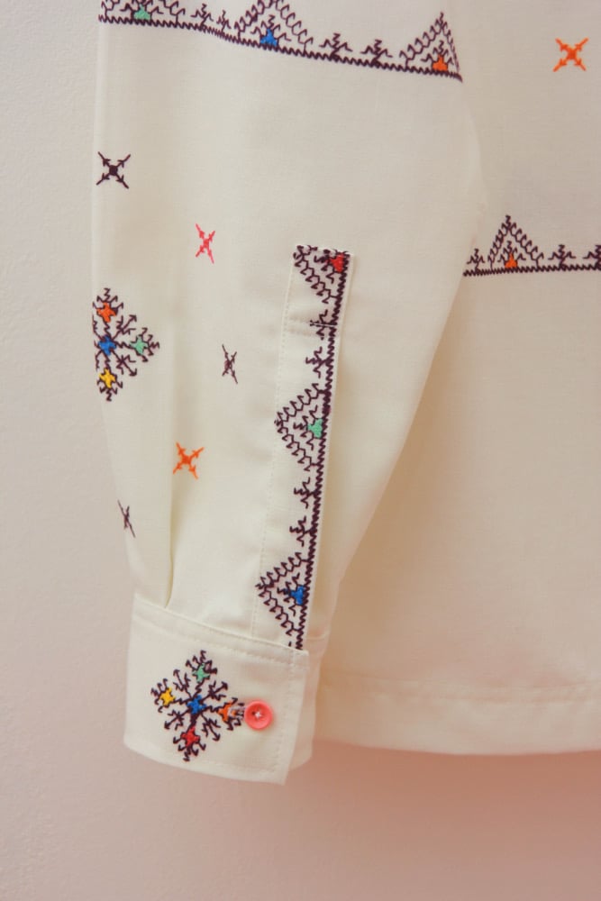 This shirt is made from a vintage embroidered medium weight 100% cotton textile, featuring a single breast pocket and finished with organic hand dyed corozo buttons.